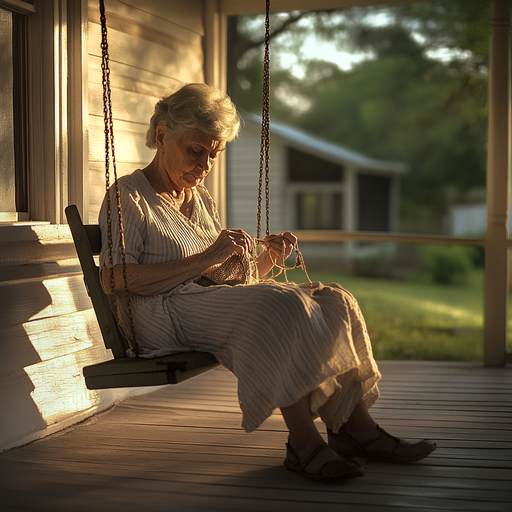 natural-lighting Natural-lighting: Serene, nostalgic ; An elderly woman, knitting on a porch swing, bathed in the warm glow of the afternoon sun; medium-shot; Normal People; Cozy, rural porch; cinematic