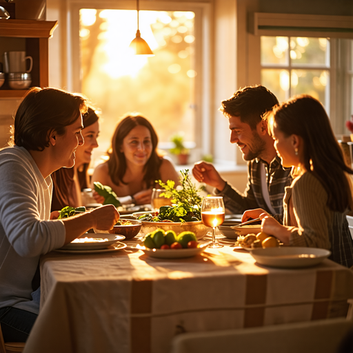 Impressionist: Intimate, heartwarming ; A family gathered around a table, sharing a meal, with warm, golden light illuminating their faces; medium shot; Family; A cozy kitchen with a warm, inviting atmosphere; cinematic