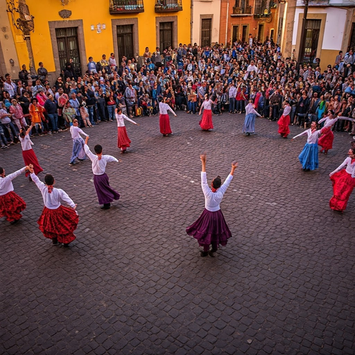 camera-positions Bird’s eye view: Energetic, festive, celebratory ; A group of dancers performing in a plaza; medium shot; Groups; cobblestone streets, colorful buildings, and a lively crowd; cinematic