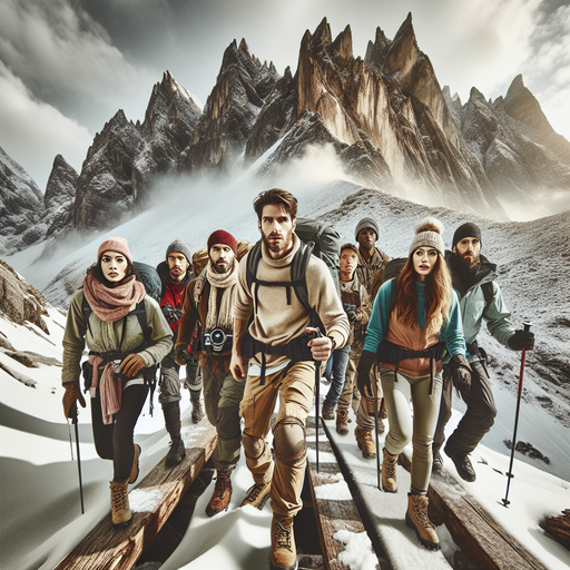 A group of determined hikers navigate a wooden path through a breathtaking snowy mountain landscape. The dramatic play of light and shadow, the imposing mountain range, and the hikers’ focused expressions capture the spirit of adventure and inspiration.