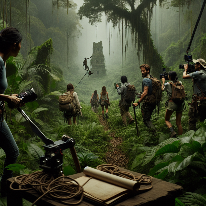 A crane shot captures a group of explorers venturing deep into a misty jungle, their cameras and equipment hinting at a thrilling expedition. The mysterious temple in the distance beckons, promising adventure and intrigue. What secrets lie hidden within its ancient walls?