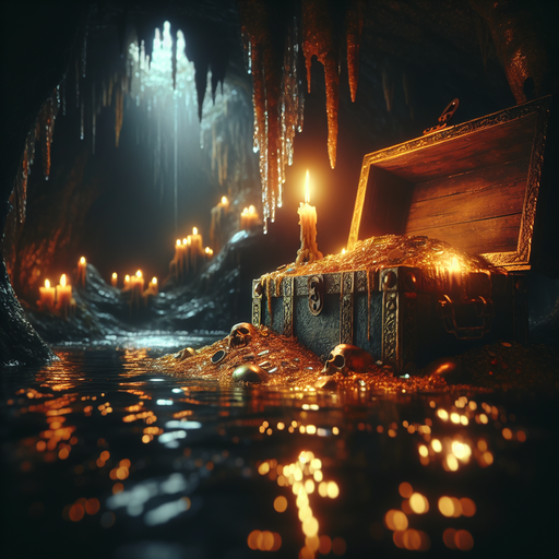 A mysterious cave, illuminated by flickering candles and a single beam of light, reveals a treasure chest overflowing with gold coins, skulls, and jewels. Partially submerged in a shallow pool of water, the chest beckons with an air of adventure and magic. The interplay of light and shadow creates a captivating scene, drawing you into a world of mystery and intrigue.
