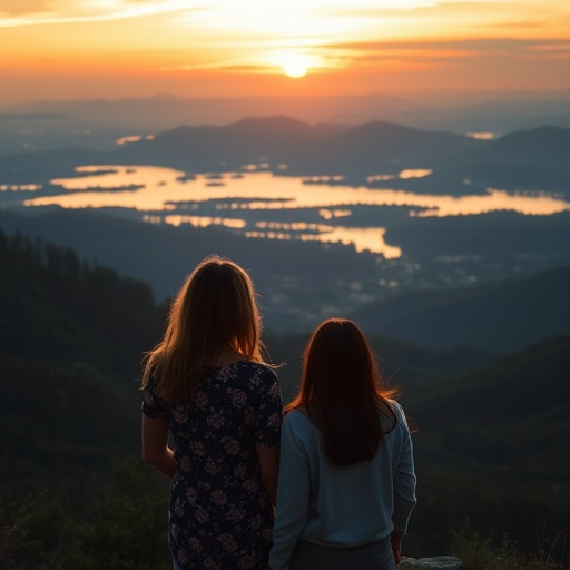 Shot : Two women, possibly sisters, stand side-by-side on a mountain overlooking a scenic valley. The sun sets in the background, casting a warm glow over the landscape.