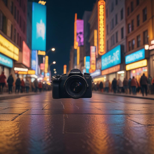 Shot : A camera lens is hovering above a city street at night. The camera is in focus and the city is blurred in the background.