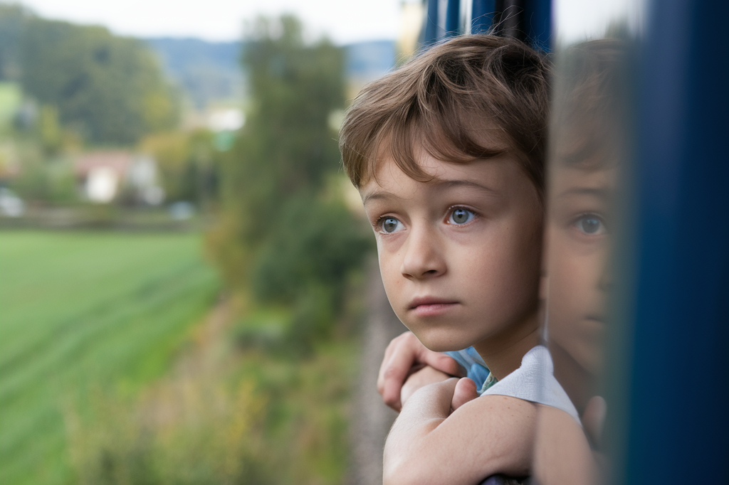 A young boy with piercing blue eyes gazes out the window of a train, his expression a mix of pensive longing and wistful melancholy. The image captures a fleeting moment of introspection, as he seems to be lost in thought, perhaps reminiscing about a past experience. The rural countryside whizzing by outside serves as a backdrop to his internal journey, leaving the viewer to wonder about the stories hidden within his gaze.
