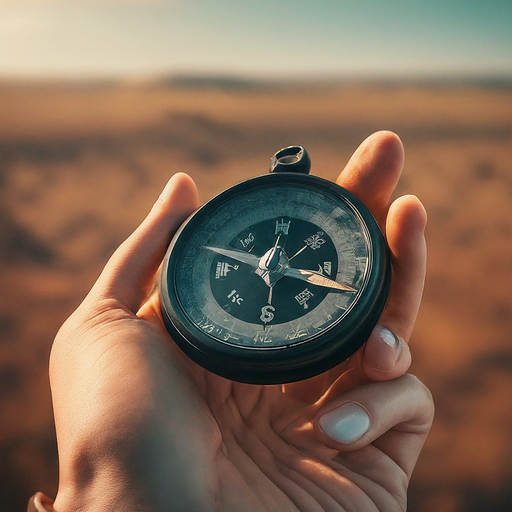A hand holds a compass, its needle pointing towards an unknown horizon. The shallow depth of field draws your eye to the compass, emphasizing the act of navigation and the journey ahead. This minimalist image evokes a sense of adventure and contemplation, inviting you to explore the path less traveled.