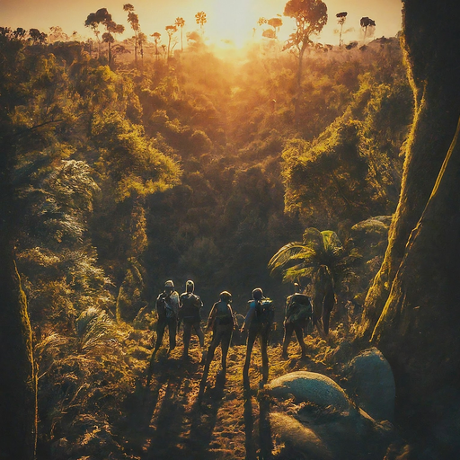 Extreme Long Shot: Mysterious, adventurous ; A group of adventurers, silhouetted against a blazing sunset, standing on the edge of a vast jungle; Extreme Long Shot; Adventure; A dense, lush jungle with towering trees and hidden paths; cinematic