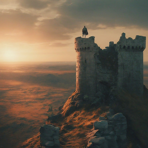 Mid-shot or medium-shot: epic, hopeful ; A lone figure, silhouetted against the setting sun, stands atop a crumbling castle wall; medium shot; heroism; a vast, desolate landscape; cinematic