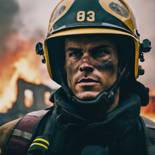 A close-up portrait captures the unwavering focus of a firefighter, helmet emblazoned with the number 83, as he stares directly into the camera. The background blurs into a fiery inferno, highlighting the stark contrast between the firefighter’s calm determination and the chaotic scene behind him.