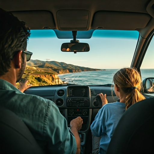A tranquil moment captured as a father and daughter drive along a scenic coastal road, the open window inviting the ocean breeze and the promise of adventure. The image evokes a sense of freedom and contemplation, perfect for those seeking a peaceful escape.