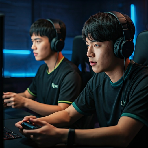 camera-positions Two-shot: Intense, focused, competitive ; Two gamers, intensely focused on a screen, controllers in hand; Two-shot; Gaming; A dimly lit room with neon lights; cinematic