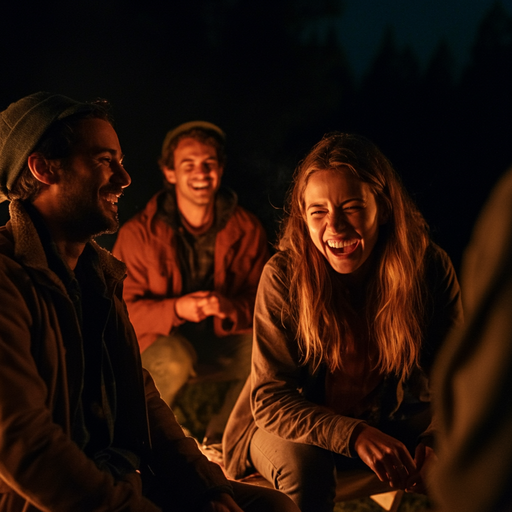 Three friends gather around a crackling campfire, their laughter echoing through the darkness. The warm glow of the flames creates a sense of intimacy and joy, capturing the essence of a perfect night spent with loved ones.