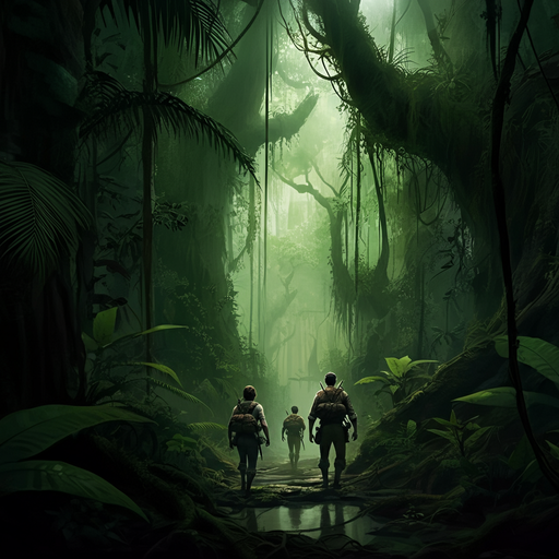 Three figures venture deeper into a dense, mysterious jungle, their path shrouded by towering trees and thick foliage. The air hangs heavy with intrigue, as vines and branches create an eerie atmosphere. This image captures the essence of adventure and suspense, leaving viewers wondering what secrets lie ahead.