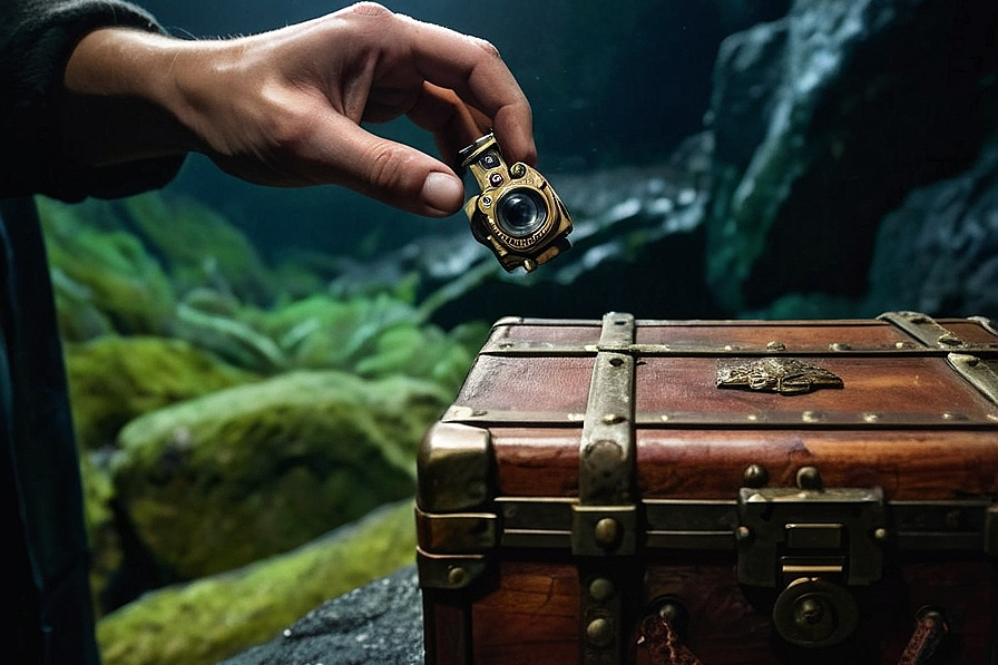 In a dimly lit, cave-like setting, a hand delicately holds a small, ornate golden camera above a weathered wooden treasure chest. The camera’s size, dwarfed by the chest, hints at a secret waiting to be revealed. Lush greenery blurs in the background, adding to the air of mystery and adventure. This image evokes a sense of antique wonder, inviting you to explore the hidden stories within.