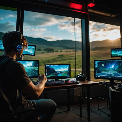 A gamer, bathed in the warm glow of a setting sun, sits engrossed in his game, surrounded by multiple monitors. The dramatic light highlights the focus and serenity of the scene, showcasing the beauty of technology and nature intertwined.