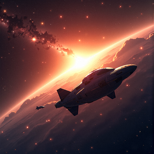 A spaceship streaks through a vibrant red sky, silhouetted against the backdrop of a cloudy planet and a distant, brilliant star. The scene evokes a sense of mystery, adventure, and the vastness of the future.