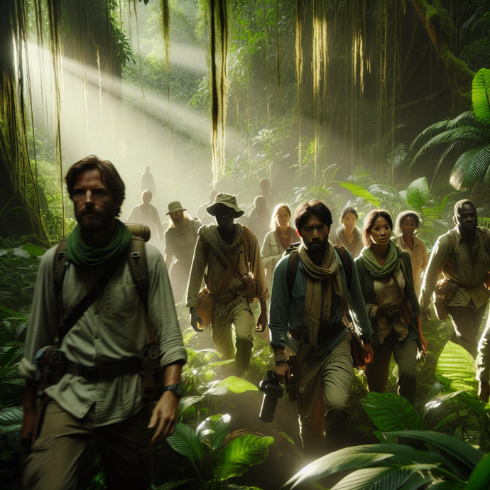 Step into a world of verdant wonder and hidden secrets. A group of explorers ventures deep into a dense jungle, where dappled sunlight paints the path ahead. The air crackles with anticipation as they navigate the unknown, their every step a testament to the allure of the wild.
