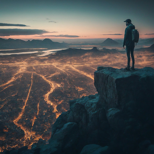 A lone adventurer stands on a precipice, gazing out at a desolate landscape bathed in an otherworldly glow. The dramatic contrast between the solitary figure and the fiery expanse evokes a sense of loneliness, epic scale, and adventurous spirit.