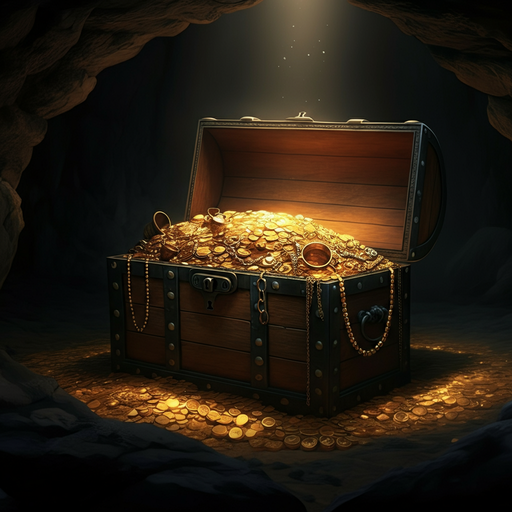 Discover a hidden cave illuminated by a warm glow, revealing a treasure chest overflowing with gold coins. The scene evokes a sense of mystery, adventure, and wealth, with the dramatic play of light and shadow adding to the allure.