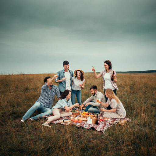 A group of friends gather for a joyful picnic in a field, their laughter echoing under a cloudy sky that adds a sense of anticipation and drama to the scene.