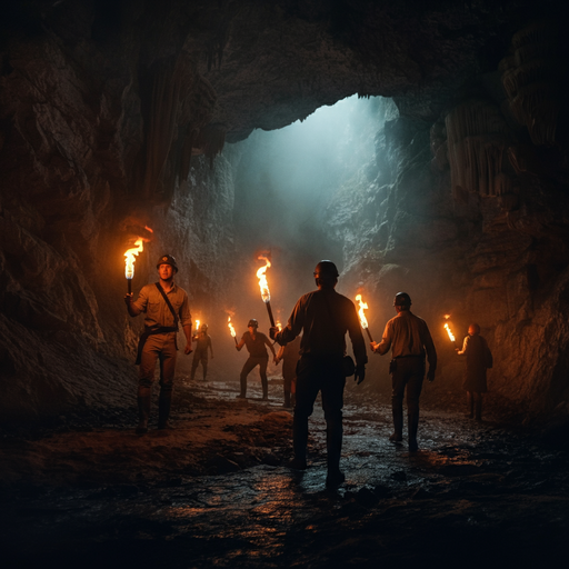 A group of explorers venture deep into a mysterious cave, their torches casting flickering shadows as they navigate the darkness. The promise of light at the end of the tunnel fuels their adventurous spirit, but a sense of suspense lingers in the air.