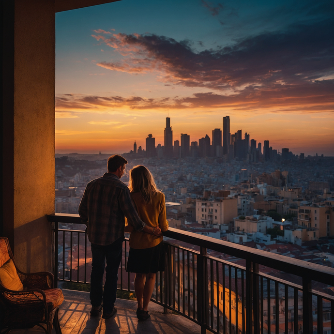 A couple stands on a balcony, their silhouettes framed against the vibrant hues of a setting sun over a sprawling city. The scene evokes a sense of romance, peace, and nostalgia, capturing the beauty of a shared moment in time.
