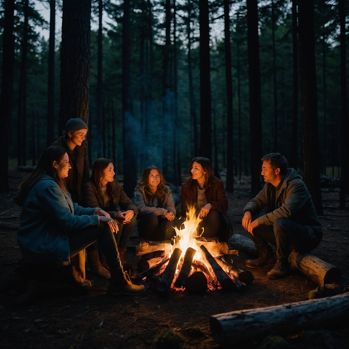 Leading Lines: Intimate, cozy ; A group of friends gathered around a campfire, with the flames casting flickering shadows on their faces; medium shot; Family; A dark, wooded forest; cinematic