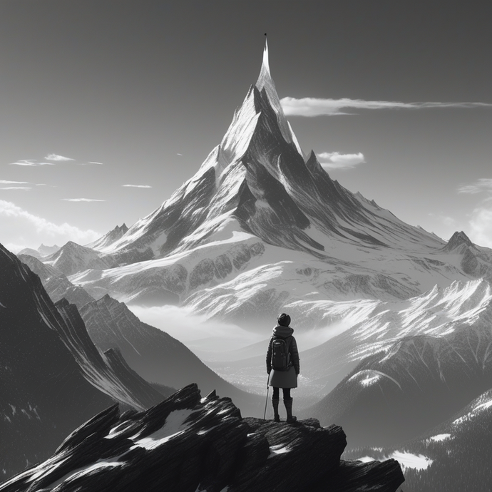 Shot : A lone hiker stands on a mountain ridge, gazing towards a majestic snow-capped peak in the distance. The scene is captured in black and white, highlighting the stark beauty of the mountainous landscape.
