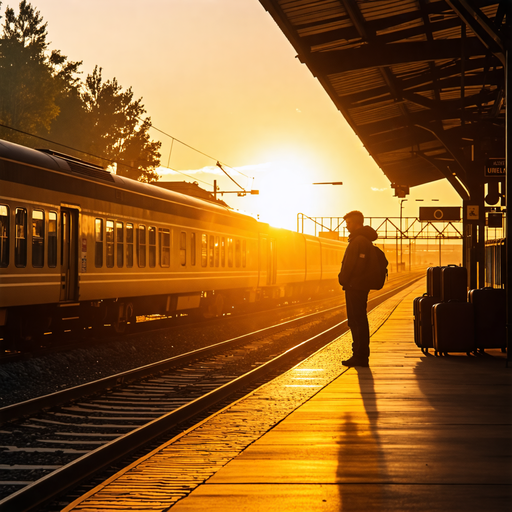 A lone figure stands silhouetted against the vibrant hues of a golden hour sunset, waiting on a deserted train platform. The scene evokes a sense of tranquility, hope, and a touch of melancholy, as the man’s silhouette suggests both anticipation and a quiet reflection on the journey ahead.