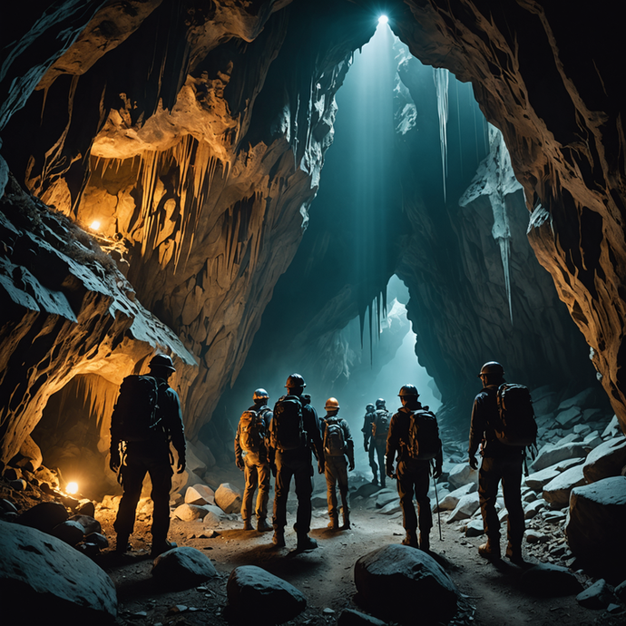 A group of explorers, helmets gleaming under the faint light of their headlamps, stand at the edge of a cavernous chamber. The darkness of the cave, punctuated by jagged stalactites, gives way to a brilliant light at the opening, promising adventure and the unknown.