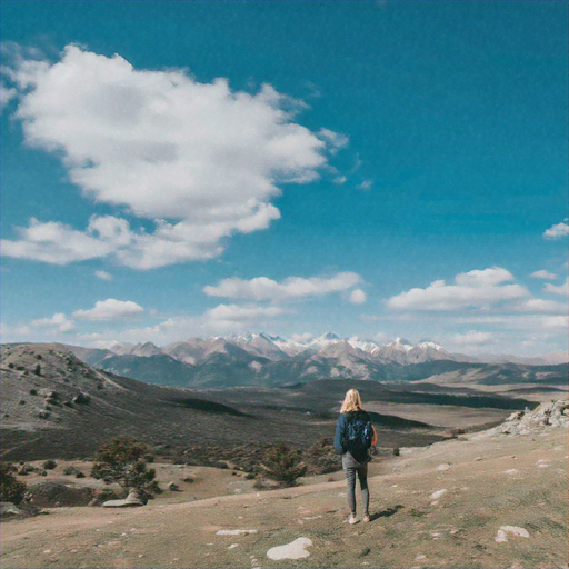 Color Contrast: Awe-inspiring, peaceful ; A lone traveler standing in front of a majestic mountain range; long shot; tourism; a bright, clear blue sky with fluffy white clouds; cinematic