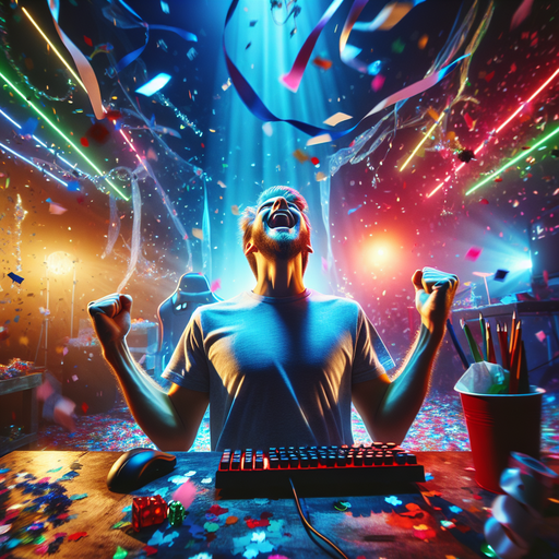 A young man, radiating joy, sits before his computer amidst a flurry of confetti and colorful lights. The scene captures the energy and excitement of a momentous achievement, though the composition feels slightly chaotic. The mood is undeniably joyful, energetic, and playful, making this a moment of pure celebration.