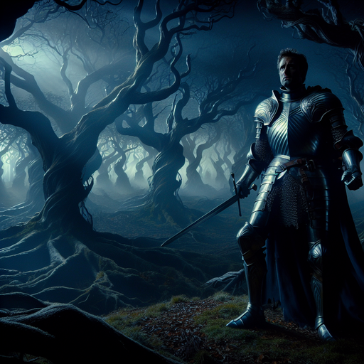A lone knight stands amidst a dark, eerie forest, his silhouette a stark contrast against the gnarled trees and swirling mist. The dramatic lighting and his solitary presence create a sense of foreboding and mystery, leaving you wondering what secrets lie hidden within the shadows.