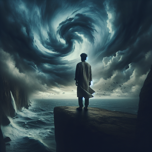 A lone figure stands defiant against the elements, silhouetted against a sky of swirling, ominous clouds. The turbulent sea below reflects the drama unfolding above, creating a scene of raw power and unsettling beauty.