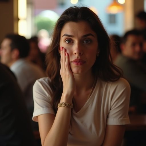 facial-expressions Embarrassment: Awkward and self-conscious ; A single woman; eye-level; Single Persons; A crowded cafe with loud chatter and laughter; cinematic