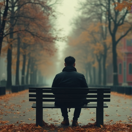 A solitary figure sits on a bench in a misty park, surrounded by bare trees and fallen leaves. The scene evokes a sense of melancholy and contemplation, with the fog adding an air of mystery and loneliness.