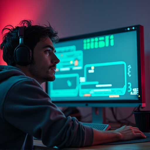 A young man, headphones on, is completely immersed in the digital world. The vibrant green and blue interface on his screen, combined with the contrasting red and blue lighting, creates a sense of mystery and intensity. His focused expression and the blurred background further emphasize his concentration, leaving the viewer wondering what challenges he faces within this digital realm.