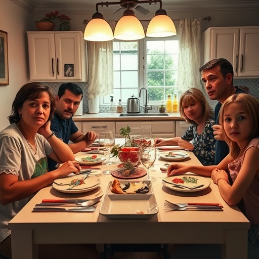 facial-expressions Confusion: Awkward, uncomfortable ; A family at a dinner table; eye-level; Normal People; a brightly lit kitchen with mismatched plates and silverware; cinematic
