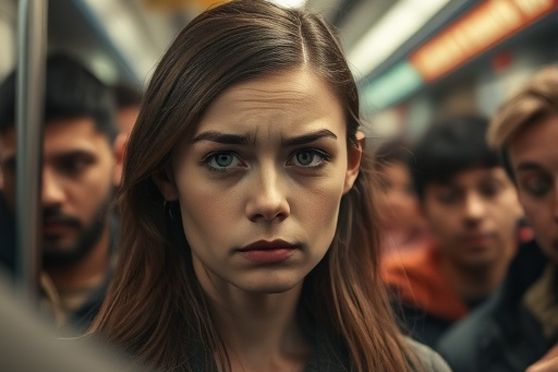 facial-expressions Worry: anxious, overwhelmed ; Young woman in a crowded subway; eye-level; Normal People; blurred faces of commuters; cinematic