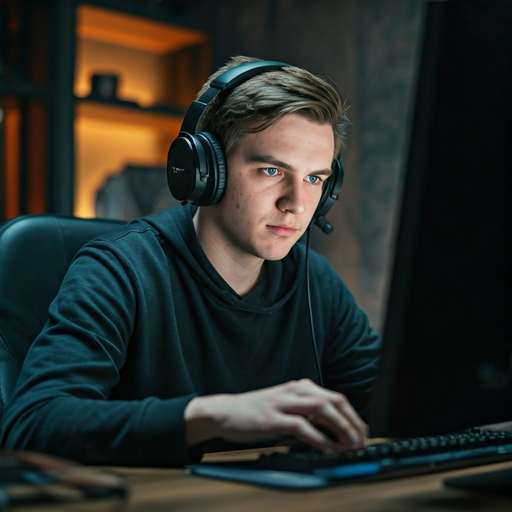 Shot : A young man is sitting in a dark room, wearing headphones and looking intently at a computer screen. He is typing on a keyboard with his right hand, and his left hand is resting on the desk. The room is dimly lit, and the only light source is coming from the computer screen.