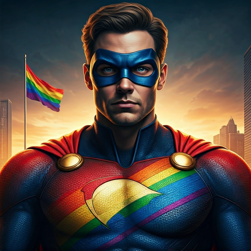 A powerful image captures a superhero, clad in vibrant colors, standing tall against a city skyline and a rainbow flag. The scene evokes a sense of heroism, hope, and empowerment, symbolizing strength and progress.