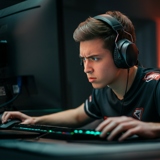A young man, headphones on, eyes locked on the screen, embodies the intensity of competitive gaming. The tight framing emphasizes his concentration, creating a palpable sense of tension and anticipation.