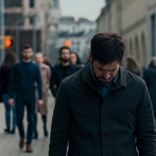 Shot : A man walks down a city street, head down, lost in thought. The background is blurred, suggesting a sense of isolation.