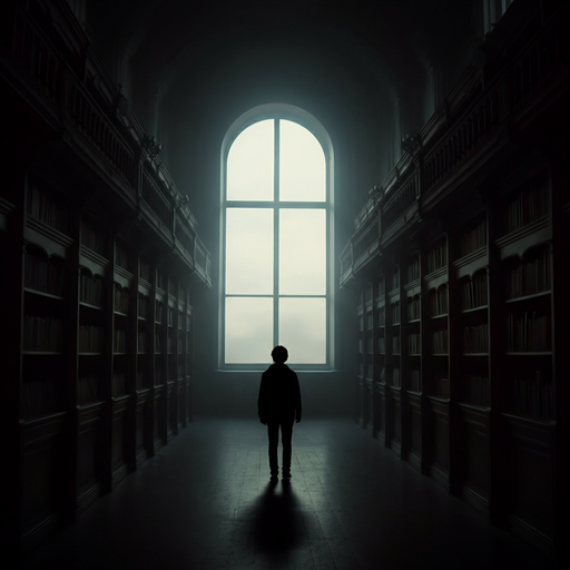A solitary figure stands bathed in the soft glow of a distant window, their form a stark silhouette against the shadowy depths of a library hallway. The image evokes a sense of mystery, loneliness, and contemplation, leaving the viewer to ponder the story behind the figure’s presence.