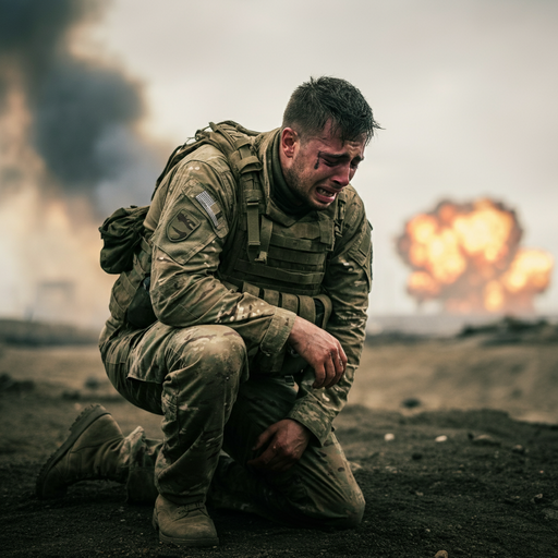 A poignant image captures the raw emotion of war, as a soldier kneels in despair, his face streaked with tears, against the backdrop of a devastating explosion. The low angle shot emphasizes the soldier’s vulnerability and the profound impact of conflict on the human spirit.
