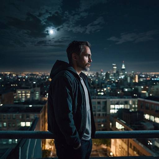 A solitary figure stands on a rooftop, bathed in the soft glow of the moon, gazing out at the sprawling cityscape below. The scene evokes a sense of melancholy and contemplation, as the man’s silhouette against the urban backdrop speaks to the loneliness and introspection of city life.