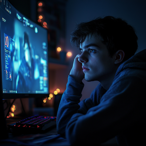 A young man sits alone in a dimly lit room, his face illuminated by the glow of his computer screen. His gaze is directed away from the screen, lost in thought. The low-light setting and his pensive expression create a sense of mystery and intrigue, hinting at a moment of deep contemplation.
