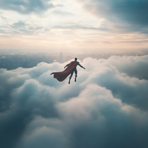 Witness the awe-inspiring power and freedom of a superhero as they soar through the clouds, leaving the city far below. This epic scene evokes a sense of hope and inspiration, capturing the essence of a true hero’s journey.