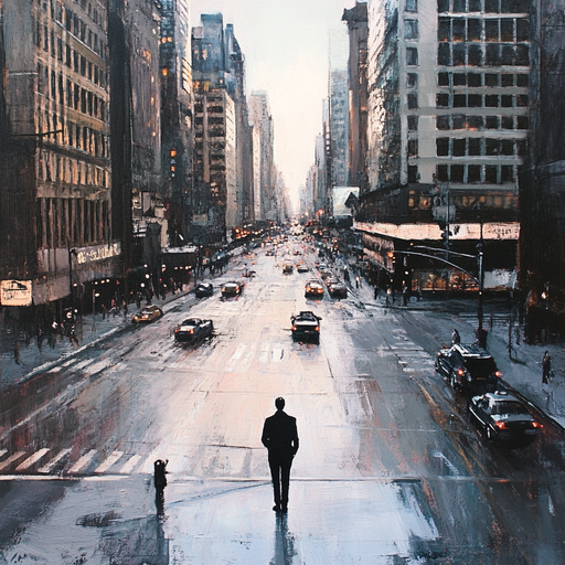 Shot : A city street scene, viewed from a high angle, looking down a long street lined with tall buildings. The street is busy with traffic and pedestrians. In the foreground, a lone man stands in the middle of the street, looking down the street. The painting is done in a realistic style, with a focus on light and shadow.