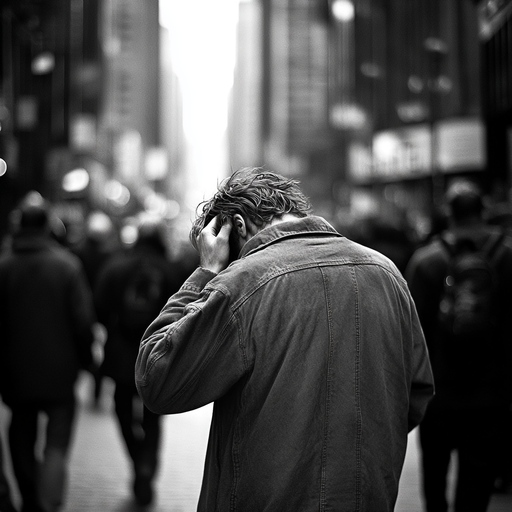 A solitary figure navigates a bustling cityscape, his head bowed and face obscured. The black and white imagery and blurred background evoke a sense of anonymity and melancholy, highlighting the man’s isolation and inner turmoil.